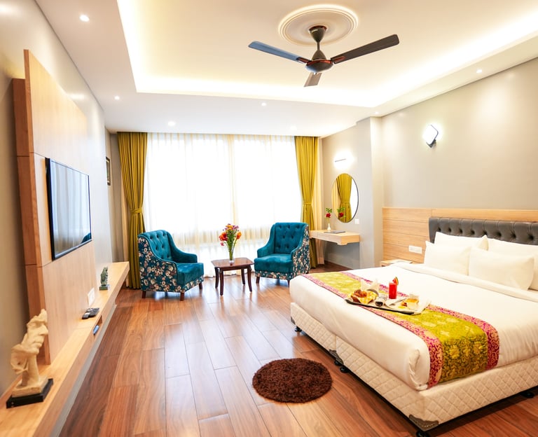 Experience elevated comfort at Amor Gangtok Resort & Spa, with scenic river and lush jungle views from expansive windows. Thoughtfully designed with modern amenities, this room offers a peaceful retreat surrounded by nature.